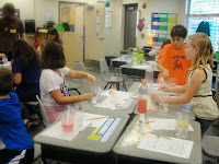 Science is fun! Today we created slime in our classroom. Students saw that, strangely enough, some mixtures ( if they are polymers) have the properties of both solid and liquid. We mixed borax and water, adding to that a mixture of glue and water, with some food color for extra interest. Suddenly, we had our slime. It was fun to observe the process. Here are a few photos from the classroom today. A special thanks to Caleb's dad, Tim who was on hand to assist! Thanks also to those who sent in extra glue so everyone could participate... It is wonderful to have such thoughtful support for our class! Dr. Dunkel stopped by about 2:20 and heard all about the properties of "slime".